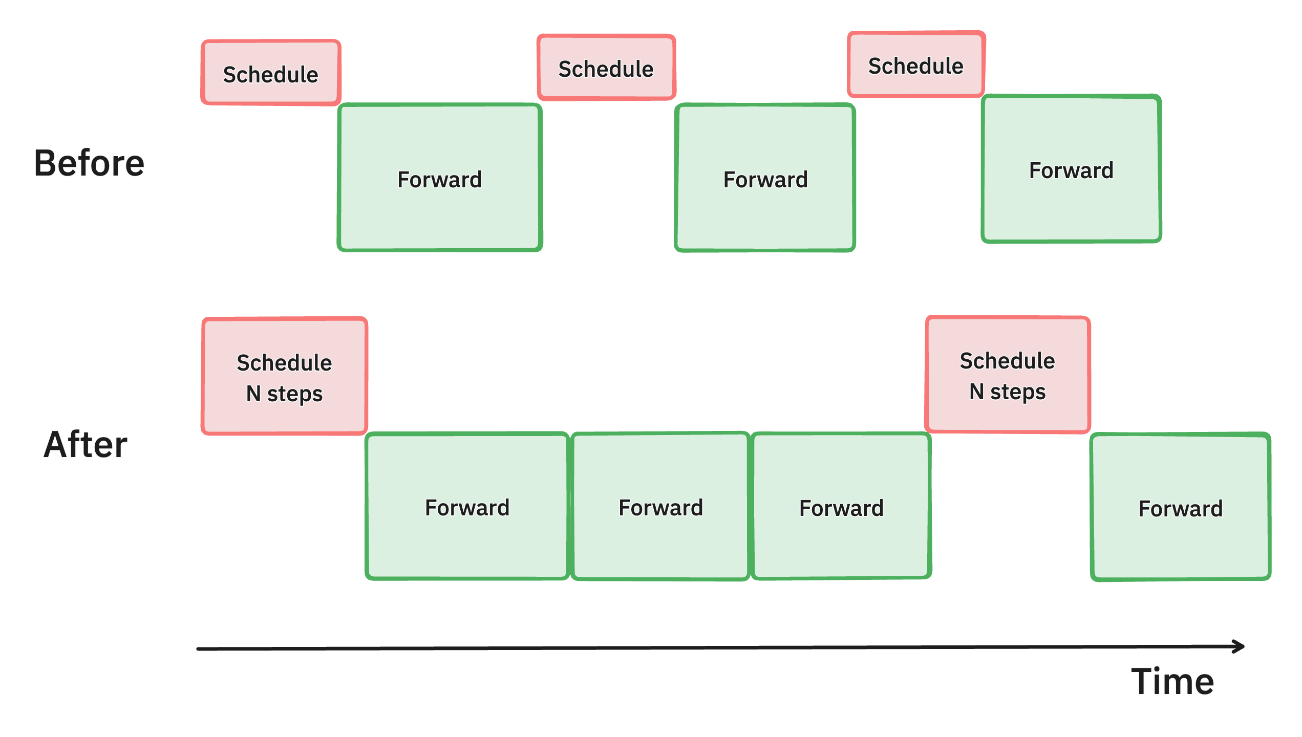 We identified that the CPU overhead from vLLM’s scheduler and input preparation was leading to GPU underutilization, resulting in suboptimal throughput. To tackle this, we introduced multi-step scheduling, which performs scheduling and input preparation once and runs the model for n consecutive steps. By ensuring that the GPU can continue processing between the n steps without waiting for the CPU, this approach spreads the CPU overhead across multiple steps, significantly reducing GPU idle time and boosting overall performance.